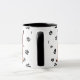 A beautiful red Irish Setter Dog looks out at you from two sides of this mug. The text between the two images says "On the 8th day, God created the Irish Setter Dog and called it VERY GOOD". The dog images and the white oval banner containing the text fields are placed on a white background with black paw prints.