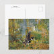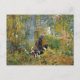 A fine art postcard with the watercolor painting by Winslow Homer (1836-1910) On the Trail (1889). A forest scene of a man hunting with his black and white retriever dog.