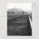 A black and white photograph of a train track in the country, taken while standing on the tracks. Detailed gritty gravel, metal rails and wooden tracks. Customize with your own "on track" or "right track" message, or enjoy as shown.
