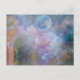 The image depicts a blue moon hanging in the sky, with shimmering stars spiralling around the rainbow clouds and rose in the middle, right above a lake.