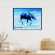A monochrome (blue) image of a cow moose walking in snow. Text reading "Canada" also appears. Moose are year-round residents in many northern communities. Here in Anchorage there are about 1500 animals, along with wolves, brown bears and other wildlife.They are usually well-behaved. They often cross streets at the crosswalks after waiting for a walk signal.