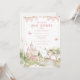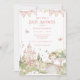 This beautifully designed invitation features soft watercolor illustrations of a sweet baby princess, her dreamy pink castle, a dainty royal carriage, and fluttering little birds — all set against a whimsical fairytale backdrop. With delicate florals and charming blush tones, it’s ideal for a baby girl shower full of elegance, magic, and love.