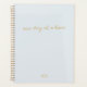 An elegant planner with handwritten script informal casual typography in gold "one day at a time" with personalized monogram in gold on a powder blue background. The perfect planner to organize your life!