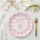 Celebrate her One Golden Year in sweet puppy style with this round paper plate. A pink gingham border surrounds a scalloped centre that features a gingham paw print and editable text for your girl's name and first birthday date. Perfect for cake slices, snacks, and photo ready table settings at any golden retriever themed party.