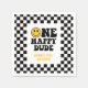 These One Happy Dude First Birthday Party Napkins feature black and white checkers with a lightning bolt smile face and is a perfect way to decorate your little one's birthday food or dessert table! Easily edit most wording, text colour and background colour to match your style and event!