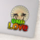 Graphic art of a silhouette of 2 palm trees with the sun shining behind and the words One Love