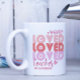 One Love Teacher Pink Modern Personalized Name Coffee Mug features the text "one loved teacher" in modern pink script typography accented with love hearts and personalized with your custom name. Perfect for your favourite teacher for teacher appreciation, birthday, Christmas, holidays and more. Designed by Evco Studio www.zazzle.com/store/evcostudio