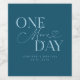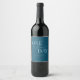 Minimalist wedding rehearsal dinner wine bottle label featuring typography text that says "one more day." The background is teal.