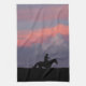My photo of the silhouettes of three horseback riders galloping across the horizon with a colorful sunset backdrop. This towel only show one of the three riders.