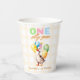 Cute one silly goose 1st birthday theme, gender neutral birthday paper cups featuring a cute watercolor baby goose with a party hat and balloons on a soft yellow gingham plaid background.