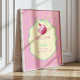 A charming pastel birthday design featuring a sleepy pink cat in a tiny party hat, framed inside a soft cream label with mint green bow details. The pink-and-yellow striped background adds a cheerful retro touch.