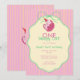 A charming pastel birthday design featuring a sleepy pink cat in a tiny party hat, framed inside a soft cream label with mint green bow details. The pink-and-yellow striped background adds a cheerful retro touch.