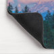 The setting sun casts colours across the land, and highlights the clouds surrounding Mount Rainier.