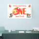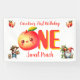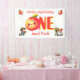 Decorate your celebration space with this whimsical first birthday party banner. The design features a delightful storybook scene with a kawaii peach character, a garden gnome, and a harvest girl in a sun-drenched orchard. Hang this vibrant backdrop behind the dessert table or high chair to create a perfect photo opportunity for your child's big milestone.