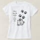 Four black cat paw prints are on one side of this shirt, with the black text on the other that says "Only my cat walks all over me". Below the cat paw prints is a cartoon image of a happy cat wearing a crown. Cute!