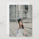 Modern graduation announcement featuring the graduate's vertical photo with "Onwards and Upwards" in a white handwritten script. Personalize the front of the photo graduation announcement by adding the graduate's name, school, and graduation year. The announcement reverses to display an additional photo with the graduate's future plans, grad party details, etc. shown below.