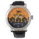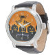 Oooh! Happy Halloween wrist watch with pumpkins in orange and black with white numerals on watch face.