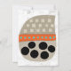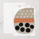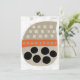 A fun, whimsical and totally cute abstract graphic in neutral colours with pops of orange and turquoise along with big black circles. The main images is a beige shape with lighter squares in 3 rows, then an orange band with aqua dots, large circles below. All on a textured white background.