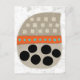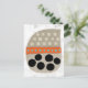 A fun, whimsical and totally cute abstract graphic in neutral colours with pops of orange and turquoise along with big black circles. The main images is a beige shape with lighter squares in 3 rows, then an orange band with aqua dots, large circles below. All on a textured white background.