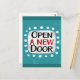 "Open A New Door" is a cute inspirational or motivational quote with a white accent shape surrounded by white textured whimsical dots.