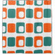 This shower curtain has a mid-century modern design of repeating orange rectangles with white rectangles inside alternating with teal rectangles.