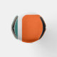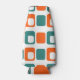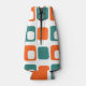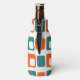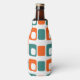 This bottle cooler has a mid-century modern design of repeating orange rectangles with white rectangles inside alternating with teal rectangles.