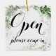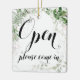 An Open and Closed retail window sign featuring pretty swirly script and a soft greenery vine with pencil drawings and wispy stems and leaves. Hang the ornament from a glass suction cup hanger on your window. To make it personal, switch out the gold cord for a favourite ribbon or jute string and tie a small bow at the top of the ornament or up on the ribbon an inch or two.