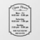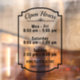 Display your business' hours of operation with this personalized vertical window cling. The design includes a modern frame shape and a flourish below the words "Open Hours," plus room for you to include the days and times of operation and more text, such as your business name and phone number. Use the easy template to personalize. DESIGN TIP: You can also "customize further" to rearrange, resize or delete any element. All fonts and colours can be changed - including the colour of the flourish and frame!