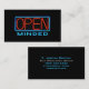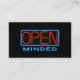 A red and blue neon sign that reads "Open" and the word "Minded" below it. "Open minded"