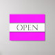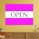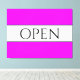This fun, nostalgic design features OPEN text inside a wide white centre stripe highlighted with black pinstripes against a bright wide tropical pink background stripes. The text can be personalized.