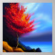 Red tree on a beach by the ocean.