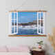 Beautiful watercolor brush rendition of a stunning seaside view out the open window at your ocean getaway.