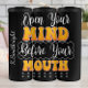 This image features an impactful phrase, "Open Your Mind Before Your Mouth," rendered in a stylish font against a light grey background. The words "MIND" and "MOUTH" are highlighted in a prominent orange with a white border, while "Open Your" and "Before Your" appear in a delicate white script. Small diamond shapes form a border at the bottom, adding a subtle decorative touch.