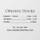 A simple, transparent Opening Hours window cling. All text is black. Under the opening times, there is the phone number and web site.