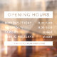 Opening hours window cling featuring white or custom colour text on a transparent background. Colours and fonts can be changed with the design tool.