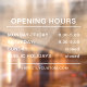 Opening hours window cling featuring white or custom colour text on a transparent background. Colours and fonts can be changed with the design tool.