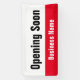 This outdoor banner is bright red, black, and white. You can edit the text to meet your needs. You can add your custom message (shown: Opening Soon Business Name). The top is white with black text. The bottom is bright red with white text for your phone number or custom text. All text can be edited or deleted.