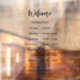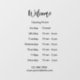 This business sign has a template you can edit to show your hours of operation. Welcome is in an elegant black script at the top of the sign. All text can be edited or deleted. The sign has a transparent background.