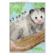 An ACEO of a good opossum mother, perched on a tree branch, with her triplets on her back. Painted with Derwent water soluble graphite and watercolor pencils.