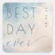 This wedding sticker features a soft, watercolor background in light blue and beige hues, creating an ethereal sky-like effect. The design prominently displays the phrase "BEST DAY ever" with bold, uppercase typography for "BEST DAY" and elegant cursive script for "ever," conveying a celebratory mood. The minimalist style focuses on clean lines and gentle blending, making it perfect for marking special occasions with a touch of sophistication and joy.