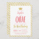 Célébrez une journée spéciale avec cet or moderne & Coral rose premier anniversaire Invitation! Ce design présente un joli graphisme de couronne et une typographie de parties scintillant d'or.