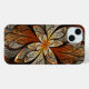 Case-Mate phone case with "La Chanteuse Flamme," copyright © 2014, Susan Wallace. Abstract stained glass leaves in shades of orange, yellow, and white frame a central flower.