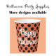 This paper cups with an orange and black polka dot design has a Happy Halloween message for your party guests.
