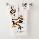Orange and black love birds sakura cherry tree with blossoms bath towel set. It features a black sakura tree with orange flowers with black hearts in the centre and a pair of love birds. Your name is written in a script style font.