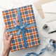 Wrapping paper with a Plaidwerx original sporty plaid pattern in bright orange, blue and white, with light blue and grey highlights.