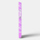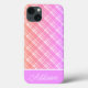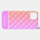 This iPhone case features an orange and purple gradient plaid pattern with a thick purple stripe and thin white stripe with a customizable name.