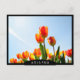 Postcard with flowers consisting of orange and red tulips seen from a low point of view against a blue sky with a black edge and in white the text 'Holland'.