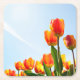 Coaster with flowers consisting of orange and red tulips seen from a low point of view against a blue sky.