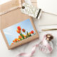 Rectangular photo sticker with flowers consisting of orange and red tulips seen from a low point of view against a blue sky.