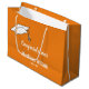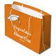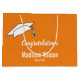 A grad cap is above the customizable graduate's name in white text on an orange background. White text says 'Congratulations'. You can customize class of year.